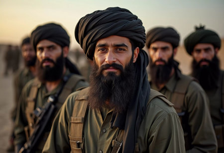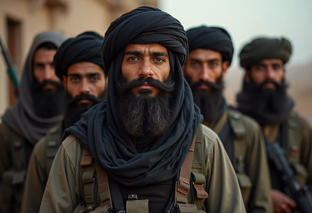 A group of Taliban soldiers stood together, their hardened expressions etched with the weight of their cause. In their eyes, a mix of determination, camaraderie, and allegiance. A solemn portrait capturing the complexities of their shared journey in a world engulfed by conflict. Generative AI