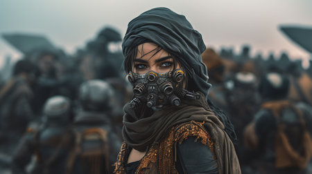 Bedouin girl in mask in post - apocalyptic scene
