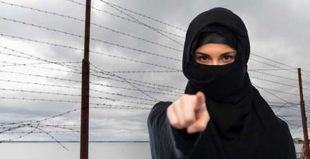 woman in hijab pointing finger over barbed wire