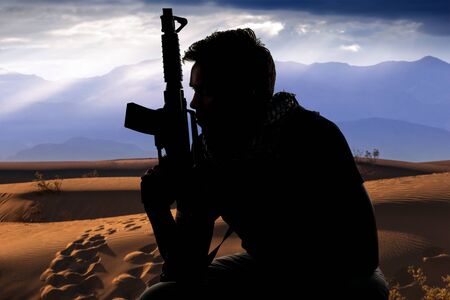 Silhouette of a male soldier resting in the shade on a desert and holding a rifle. Depicts the private military industry, militia, or special forces. He looks tired and homesick