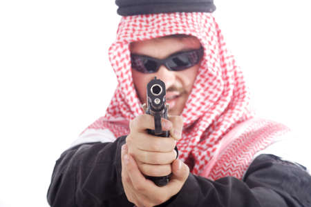 Muslim Robber holding a gun at abandoned building. Low key photo and selective focus. criminality concept.