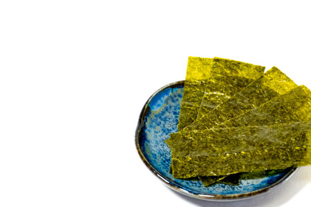 Seaweed chips on white textured background. Korean snack. Close up view. Copy space.