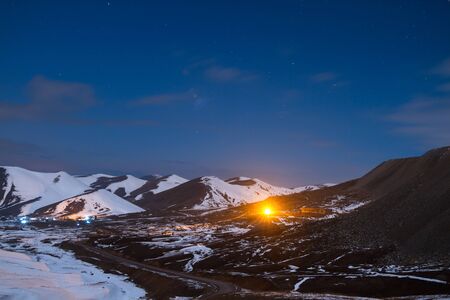 Frozen lake in the mountains at sunset. Beautiful winter landscape. Lake Bannoye, South Ural, Russia.