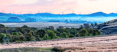 Wind turbines in the middle of the field at sunset, New Zealand