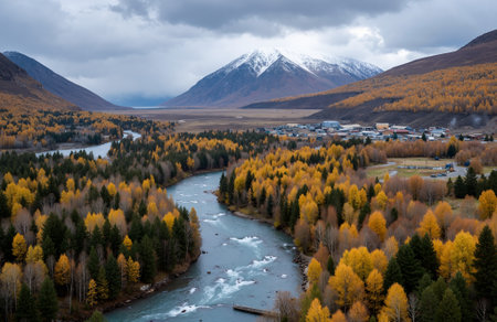Colorful bend of the river in the forest valley. Beautiful view of Altai.