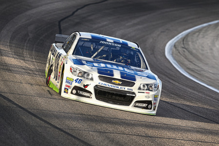 Fort Worth, TX - Apr 04, 2014: Jimmie Johnson (48) brings his race car through the turns during a practice session for the Duck Commander 500 at Texas Motor Speedway in Fort Worth, TX.