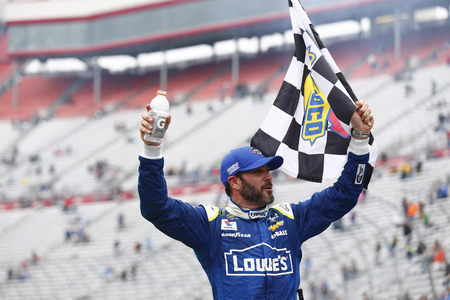 April 24, 2017 - Bristol, Tennessee , USA: Jimmie Johnson (48) takes the checkered flag and wins the Food City 500 at Bristol Motor Speedway in Bristol, Tennessee .