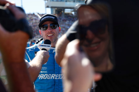 November 15, 2019 - Homestead, Florida, USA: Martin Truex Jr. (19) gets interviewed before practice for the Ford 400 at Homestead-Miami Speedway in Homestead, Florida.