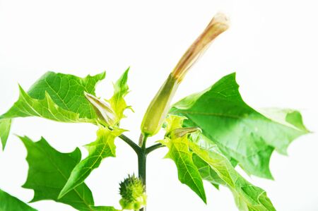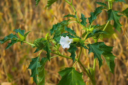 Hallucinogen plant Devil's Trumpet (Datura stramonium). White flower of Jimsonweed ( Jimson weed ), Thorn apple or Devil's snare.