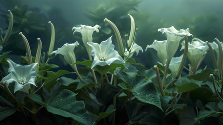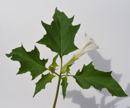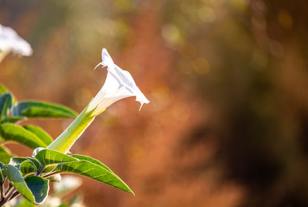White Datura flower centered, wntire plant, high key, selective focus and lots of copy-space. Daturas, or devil's trumpets, are poisonous flowering plant belonging to the family Solanaceae.