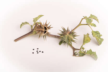 Dried capsules and seeds of datura stramonium burundanga plant on white background