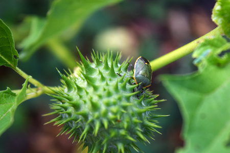 Thorny fruits of Datura stramonium plant. Jimson weed with green unripe fruits on branch