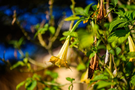 Brugmansia flowers blossom, gardening in California, USA. Natural botanical close up background. Yellow bloom in spring morning garden, fresh springtime flora in soft focus. Angels trumpets plant.