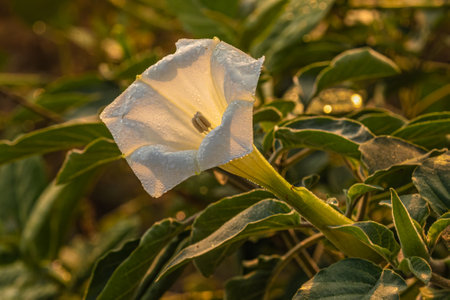 side view from White desert wildflower called Sacred Datura wrightii, angel's trumpet or Jimson weed in iran with morning light on it