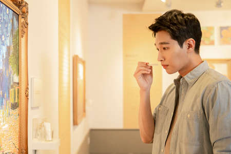 Serious professional art critic wearing eyeglasses standing in modern art gallery looking at black and white photos on wall at exhibition