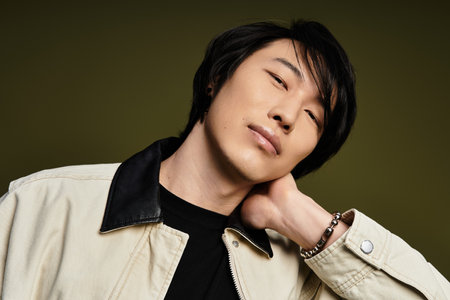 Confident Asian man with a relaxed vibe showcases modern style in bright light.