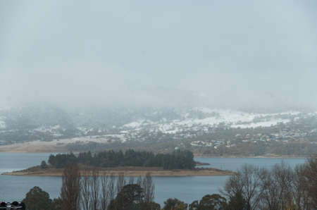 Lake Jindabyne during snowfall taken from the Alpine Way