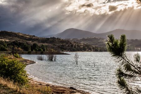 Sun Rays shining through clouds on the Hills of Lake Jindabyne, Australia.