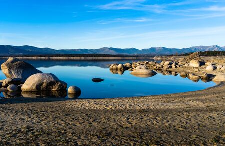 stones or rocks in lake or see with mountains in background and sand in the front under blue sky