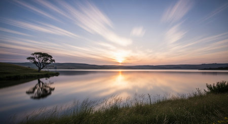 A single, gnarled tree stands on the left bank of a still lake, its dark silhouette sharply defined against a vibrant sunset. The sky is filled with dramatic, wispy clouds streaked with orange, pink, and yellow hues, all beautifully reflected in the mirror-like surface of the water. The foreground tall, dry grass swaying gently. The overall mood is one of profound peace and natural grandeur.