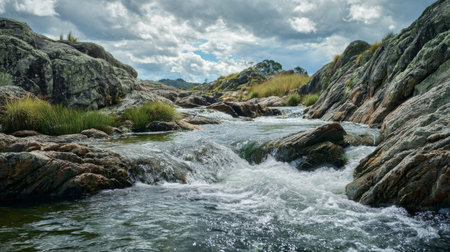 A captivating view of gentle water flowing over rugged rocks beneath a dramatic sky, surrounded by lush greenery, ideal for conveying tranquility and natural beauty.