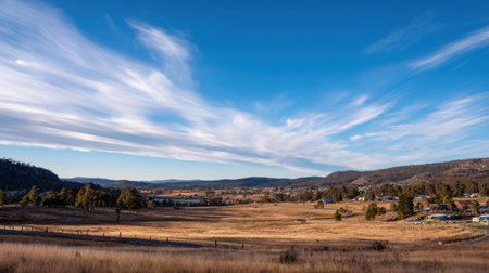 Experience the serene beauty of nature with this stunning panoramic landscape, featuring a bright blue sky, soft clouds, and distant mountains in a peaceful rural setting.