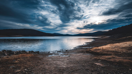 A tranquil lakeside scene at twilight showcasing calm water reflecting a dramatic sky filled with clouds, distant hills creating a serene atmosphere in nature.