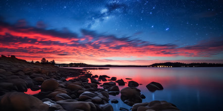 Vibrant sunset hues blending with a star-filled sky above smooth rock formations along a tranquil lakeshore