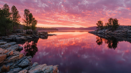 Stunning Sunrise Over Calm Lake Waters with Rocky Shoreline Reflecting Vivid Colors and Serenity