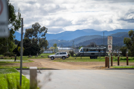 Caravan camping at a camp ground off grid on a holiday in spring