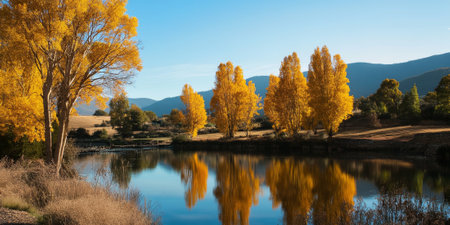 A tranquil lake surrounded by golden autumn trees. The water reflects the vibrant foliage, creating a picturesque natural scene.