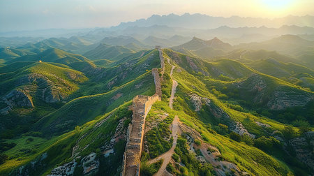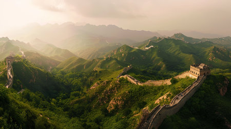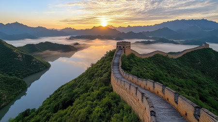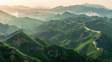 A breathtaking sunrise view over Great Wall of China, surrounded by misty mountains and lush