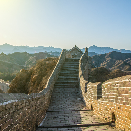 Stone staircase of Great Wall of China, section Mitianyu. Suburbs of Beijing.