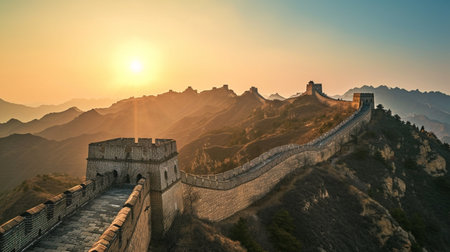 Where Legends Breathe: Golden light bathes the Great Wall as the sun descends, casting long shadows on its ancient path. AI-generated