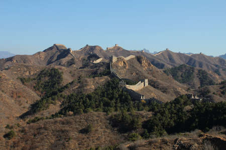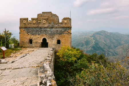 A panoramic view on a renewed Jinshanling part of Great Wall of China. The wall is spreading on tops of mountains. Many watchtowers on the peaks. Dense forest around it. World wonder. Tradition
