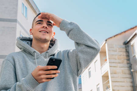 Young man hold a smartphone while using tiktok app,social network tech addiction