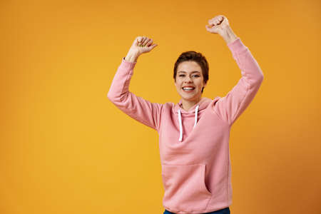 Millennial young woman in pink hoodie on white background. Women empowerment concept. Hands up happy woman. Feminism superwoman portrait