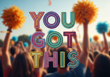 A crowd of people cheering with colorful pompoms and motivational text