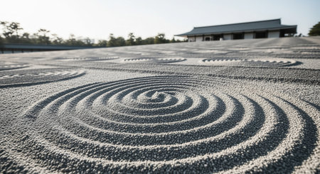 Meticulously raked white sand in a vast zen garden, featuring intricate concentric circle patterns. a traditional japanese temple building stands in the soft background, conveying peace and meditation.