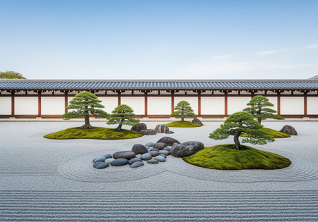 Traditional japanese zen rock garden karesansui featuring meticulously raked white gravel, large dark stones, vibrant green moss islands, and sculpted pine trees set against a temple wall under a clear sky. represents tranquility and meditation.