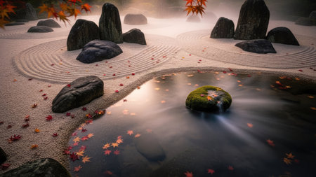 A tranquil zen garden scene features carefully arranged rocks, raked sand patterns, and a serene pool of water. The composition is enhanced by autumn leaves, soft lighting, and a misty atmosphere. This image could be used for various projects related to relaxation, meditation, or nature themes.