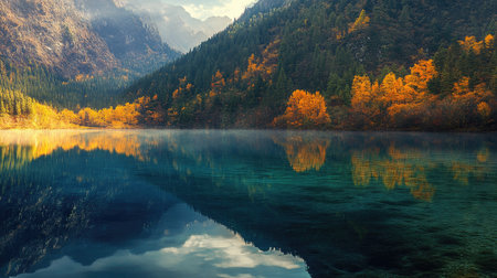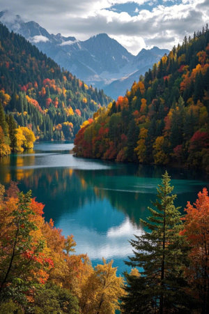 Jiuzhaigou National Parkaes lake, reflecting the brilliant autumn colors and towering mountains in its crystal-clear waters.