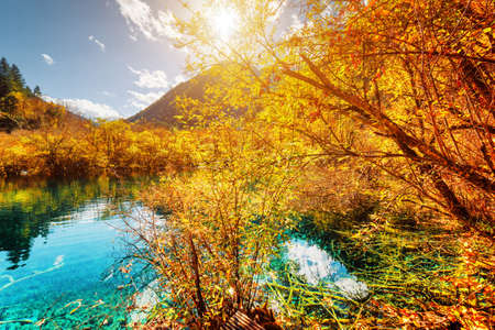 Amazing pond with azure crystal clear water among colorful fall woods at the Rize Valley in Jiuzhaigou nature reserve (Jiuzhai Valley National Park), China. The sun is shining through foliage of trees