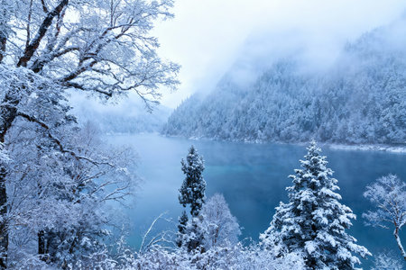 Beautiful winter landscape with snow covered trees and lake in mountains.