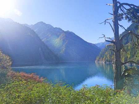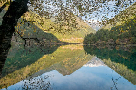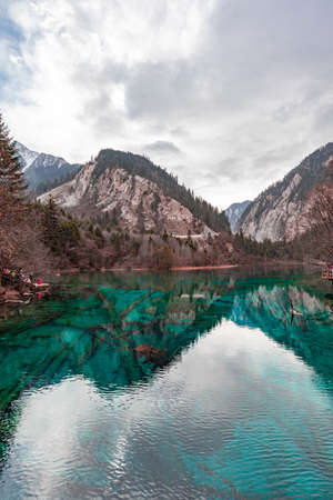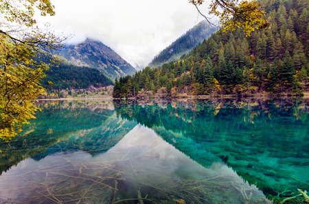Fantastic view of lake with submerged tree trunks among colorful fall woods and mountains of Jiuzhaigou nature reserve (Jiuzhai Valley National Park), China. Autumn forest reflected in clear water.