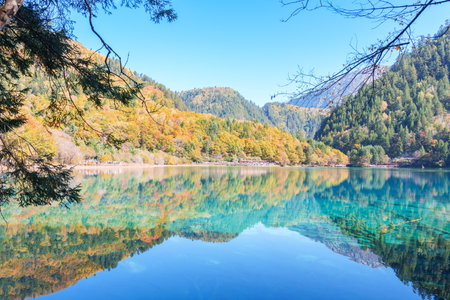 A turquoise mountain lake reflection, forested hillside, clear sky, autumn foliage, tranquil scenery, serene water at Five-Flower Lake, Jiuzhaigou in Sichuan, China