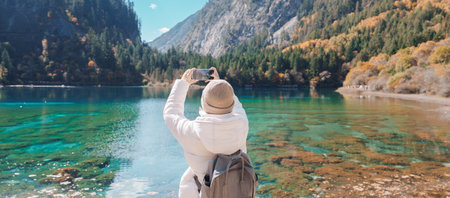Happy woman traveler travel in jiuzhaigou national park in Sichuan, China. Tourist sightseeing and taking photo beautiful lake by mobile phone in Autumn season. Famous landmark near Chengdu, China