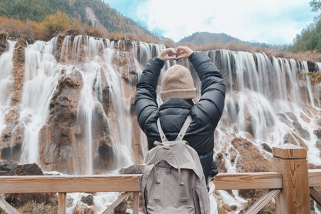 Happy woman traveler travel in jiuzhaigou national park in Sichuan, China. Tourist sightseeing Nuorilang Waterfall in Autumn season. Famous Landmark and Vacation near Chengdu, China