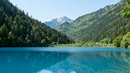 Beautiful view of scenic lake among mountains with evergreen woods in Jiuzhaigou nature reserve (Jiuzhai Valley National Park), China. Forest reflected in water. Amazing landscape.