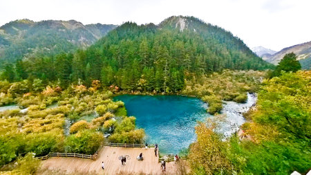 Scenery Jiuzhaigou national park in Sichuan, China. Beautiful Colorful Pond in Autumn season. Famous Landmark and Vacation near Chengdu, China. Asia travel concept